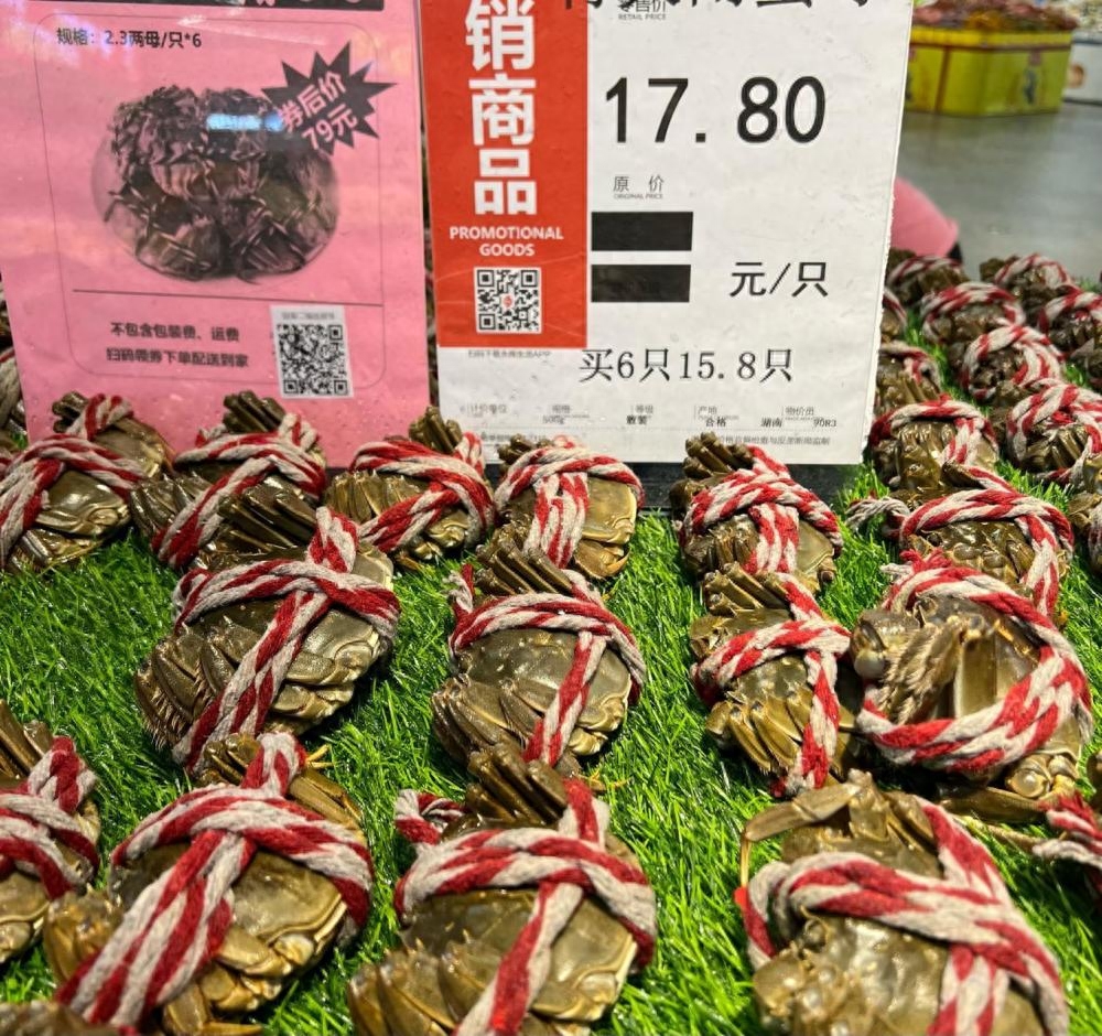 永辉超市售卖的是湖南本地产的大闸蟹,2.3两的母蟹每只17.8元,买6只每只15.8元,叠加活动券后6只79元。放在水池中散养的母蟹体重稍轻,每只12.8元,买6只每只10.8元。